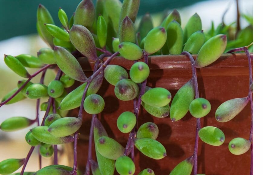 オトンナ属のルビーネックレスは、パープルに色づく葉が美しい冬型の多肉植物です。ツル状に伸びていく姿もオシャレで、鉢から垂れる様子も楽しめます。