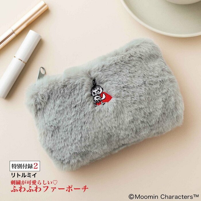 肌ざわりが気持ちいい、ふわふわのエコファーのポーチです。リトルミイのキュートな刺繍がワンポイントのアクセントに。リップなどを入れるコスメポーチとして、また、イヤホンや充電器をまとめて入れておいても便利です。