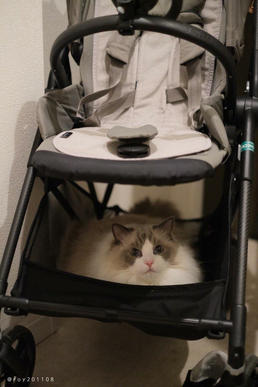 Xでたくさんの注目を浴びているのは、ラグドールの男の子「ロイ」くんです。前日お留守番の時間があったというロイくん。ベビーカーの下段に身をおさめ、キリリとした眼差しでこちらを見ています……!