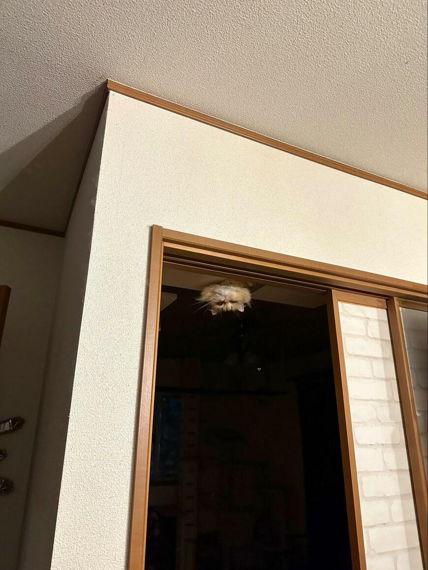 そこに写っているのは、猫の「エマ」ちゃん。電気がついていない部屋の向こう側で、天井から首を出すかのような格好をしています……!