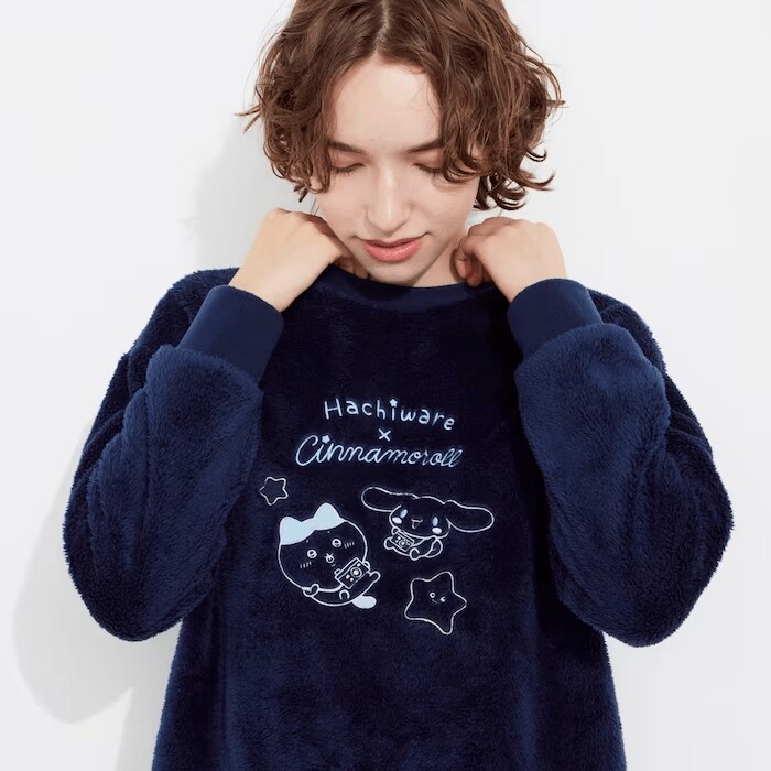 中央に描かれたハチワレとシナモロールが愛らしいフリースセットです。大人っぽさもあるネイビーカラーです。