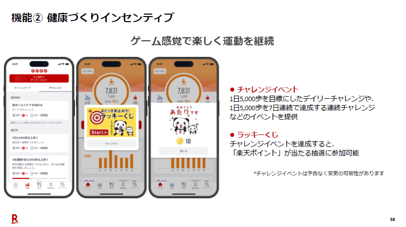 Rakutenヘルスケアは1日に5000歩、7日連続で5000歩などのチャレンジを達成すると、抽選でポイントを獲得することができます。これは保険契約者以外も利用できるものですが、保険契約者にとってもお得を上乗せする手段になります。今後は食事分析や健康診断結果記録を実装も予定しており、より健康増進の行動変容を促すアプリに進化していきそうです。