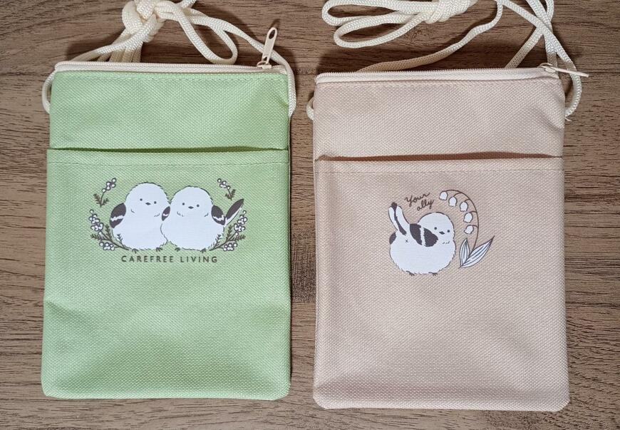 こちらがセリアで販売されている、シマエナガデザインのショルダーバッグです。写真のように2種類確認することができました。ツガイのシマエナガがかわいいグリーンと、お尻を向けているシマエナガがかわいいブラウンです。