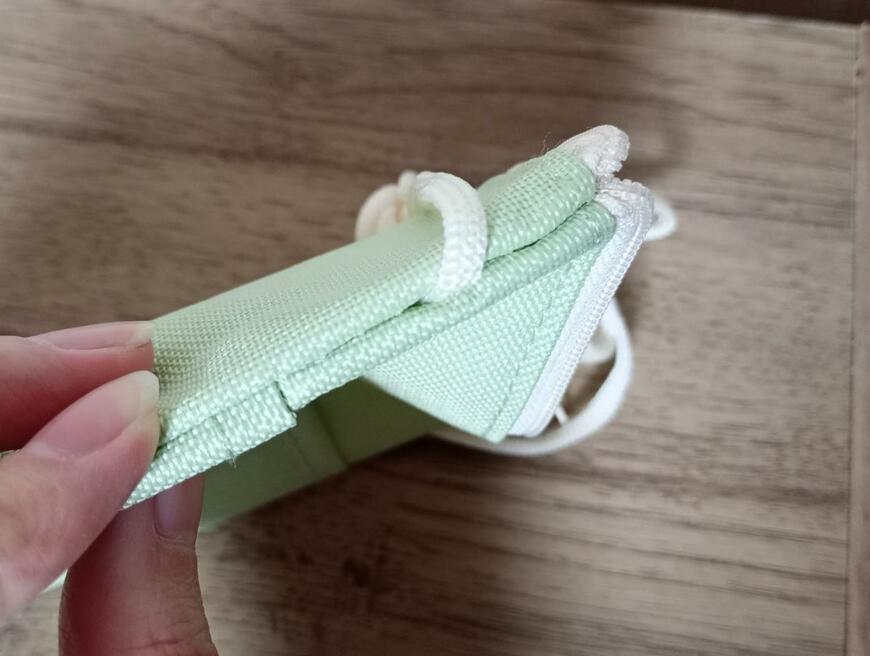 ショルダー紐は、写真のように布地にしっかりと固定されています。丈夫な作りのショルダーバッグなので、やや重みのあるものでも安心して収納できそうです。