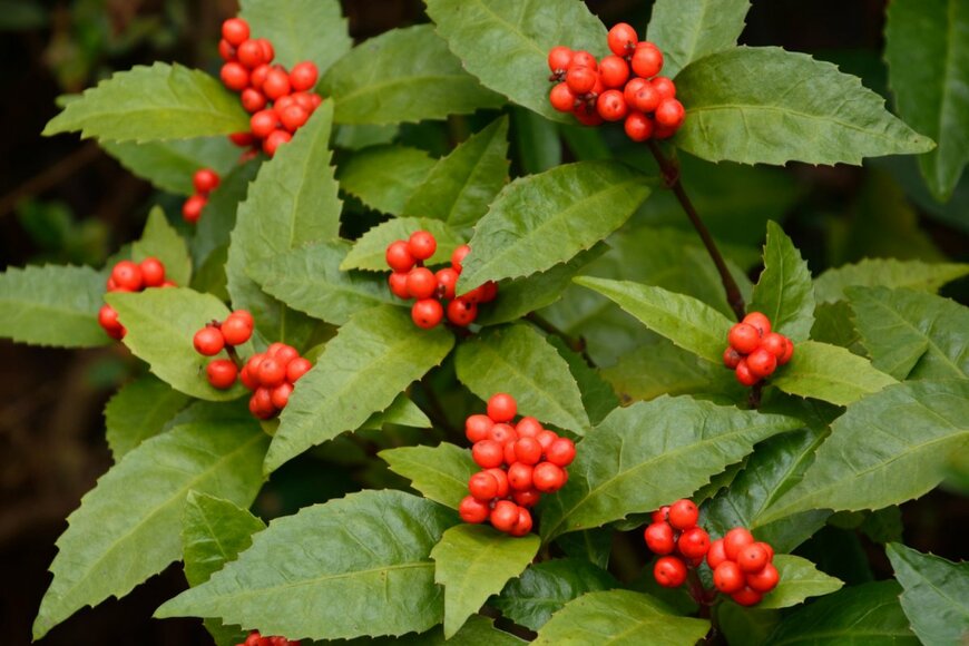 常緑低木のセンリョウは、冬に可愛らしい赤い実をつける常緑低木。マンリョウと同じく、お正月の縁起モノ植物として人気の植物です。