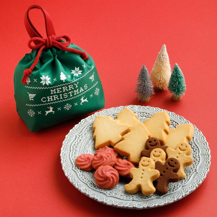 クリスマスカラーのバッグにミニジンジャーマン、ツリー、いちごのクッキーを詰め合わせています。サクサクの自家製クッキーは食べだしたら止まらないほどの美味しさが楽しめます。クリスマスの贈り物としてもいいですね。