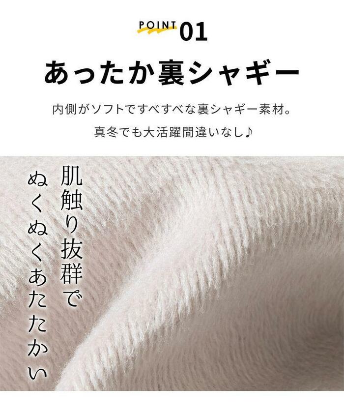 ソフトですべすべした裏シャギー素材が内側に使われています。肌触りが抜群です。着用すれば、寒い冬でも快適に過ごすことができそうです。