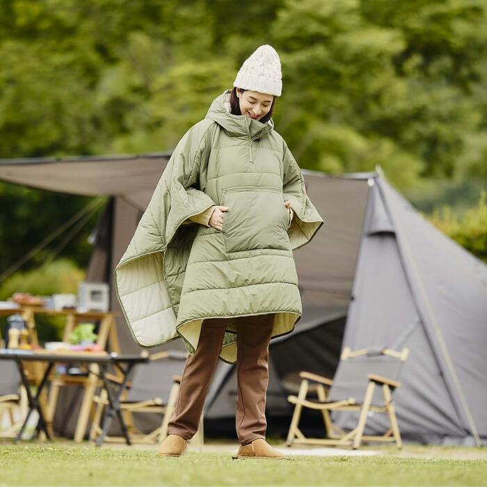ワークマンの「レディースディアテックスマルチウォームポンチョ」は、3WAY仕様で活用することができます。まずは、写真のようにポンチョとして使えます。大きなポケットがついているので、手ぶらでの外出もできそうです。