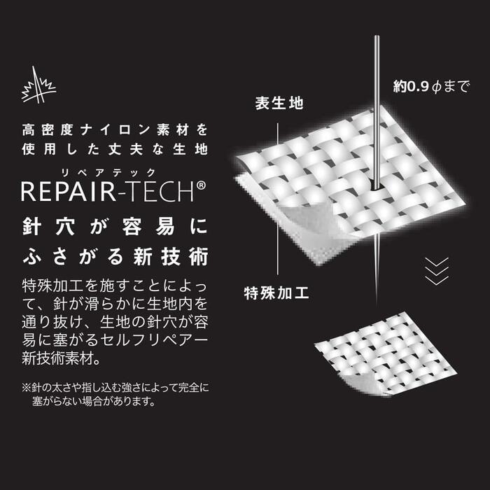 表地には、針による穴あきをこするだけで自己修復する機能「REPAIR-TECH®」が使われています。ちょっとした傷なら修復するので、キャンプなどで使っても安心です。