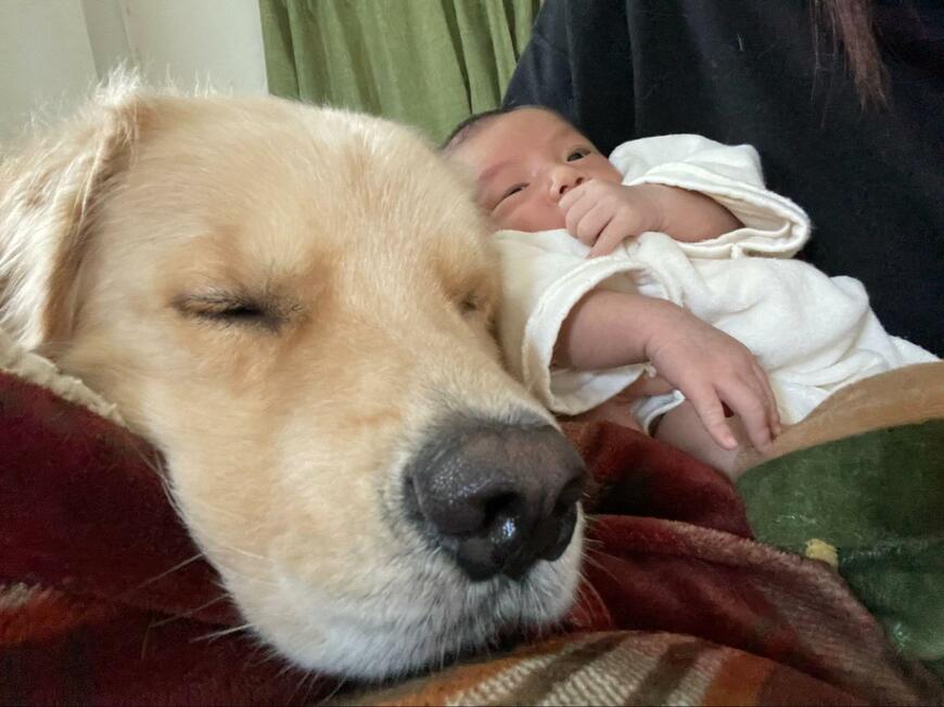 犬のふわふわのお腹にスッポリとおさまる赤ちゃん。