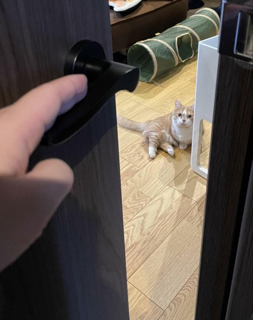 ドアの隙間から見える真剣な眼差しと、今にも立ち上がりそうなポジショニングが印象的。後ろ髪を引かれる思いで外出することになりそうです……。