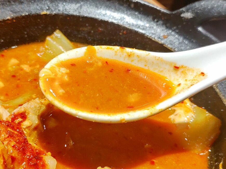 まずはスープを一口。唐辛子のしっかりと辛さが口の中に広がります。辛さが先行しますが味噌・コチュジャンのコクも。唐辛子パウダーが強いですが、帆立や海老などの魚介の旨味もあります。