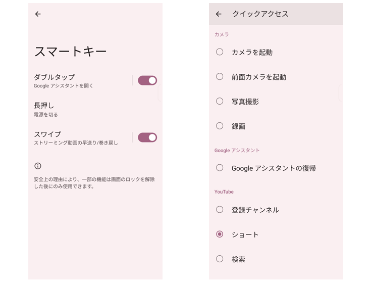 スマートキーはダブルプレス(ボタンを2回連続で押す)/長押し/スワイプの3種類があり、それぞれ「設定」のアプリから割り当てるアクションを選択できます。「Googleアシスタントを起動したり、スクリーンショットを撮ったりできて便利そう!」というのが第一印象でしたが、設定画面をみると指定のアプリを開けたり、録音を開始できたり、カメラを起動できたり…とにかく自由度が高いです。「カメラ起動」にしてもカメラを起動/前面カメラを起動/写真撮影/録画など、細かく調整することが可能です。