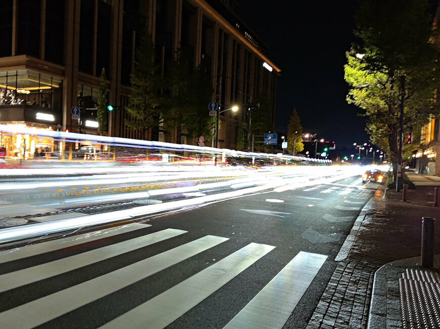 光を生かした撮影モードとしてユニークなのが、光の軌跡を幻想的に写真に表現してくれるライトレイルモードです。上級者向けかと思いきや、まったくそんなことはありません。今回は複数プリセットされている設定から「トラフィックライト」を選択して、道路を走る車をパシャリ。設定された秒数(トラフィックライトは4秒)の間、カメラを動かさず被写体に向けているだけで、アート作品のような1枚を撮影することができました。