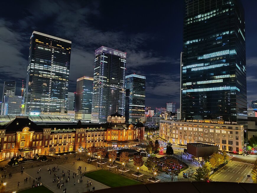 最近のスマホは多彩な撮影モードを搭載していますが、Zenfone 10が特に強いのは「夜」の撮影です。たとえば、オーソドックスな夜景モードは光の表現力が秀逸です。作例は上にオフィスビルの青白い光、下に東京駅舎の電球色という組み合わせですが、それぞれの特性がよく表れています。また、遠距離かつ日が暮れたシチュエーションだったにも関わらず、駅舎周辺の人や車もくっきりと描写されています。