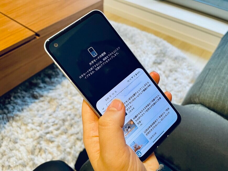 Zenfone 10のサイズは高さ約146.5mm✕幅約68.1mm✕奥行き約9.4mm、ディスプレイは5.9型ワイドとなっています。実際に手が小さめの女性に持ってもらったところ、片手でも無理なくスマホをグリップできました。画面が下半分になる「片手モード」を搭載しているなど、使いやすさも洗練されています。重さは172gと軽量なので、長時間使っていて疲れにくいのもポイントです。