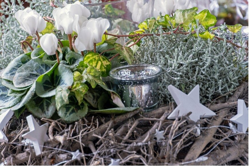 戸外での生育が可能なガーデンシクラメンは、レッドやピンク、ホワイトの花を咲かせる植物。パンジー、ビオラとも相性がよく、鉢植え栽培にも向いているので寄せ植えにはおすすめの花です。