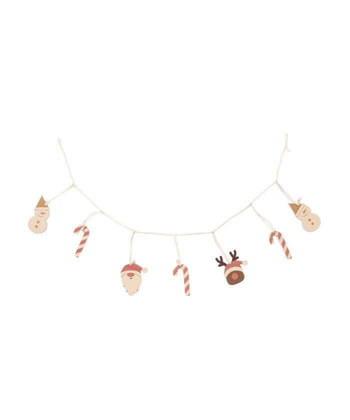 ウッド素材でやさしい色合いのガーランド。サンタやトナカイなどのクリスマスモチーフがかわいく並んでいます。