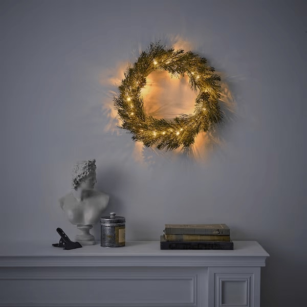 LEDライトで周りをやさしく照らしてくれるリースは、毎日同じ時刻に点灯し、6時間後に消灯するタイマーつき。電池内蔵タイプでコンセントの必要がなく、置き場所に悩みません。