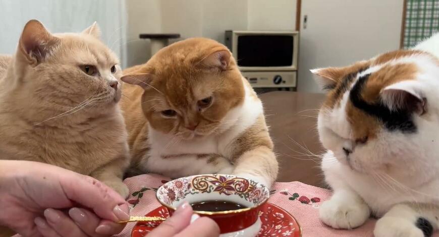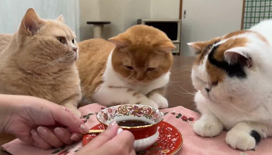 猫ちゃんに囲まれるティータイムが投稿されると、Xで多くの反響を呼びました。