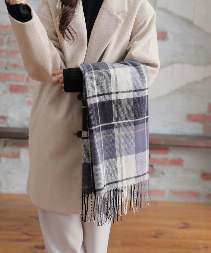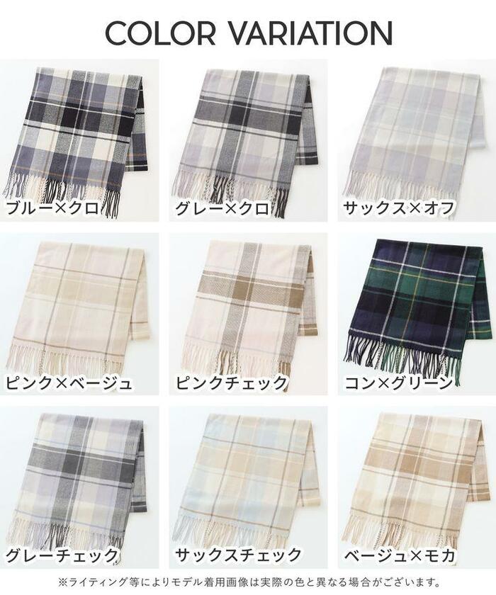 2. 「大チェック柄マフラー」は、カラーが豊富なのが魅力! コーデに華やかさをプラスしてくれます