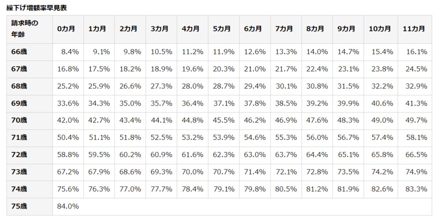 受給開始年齢ごとの年金受給額の増加割合は以下のとおりとなります。