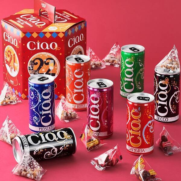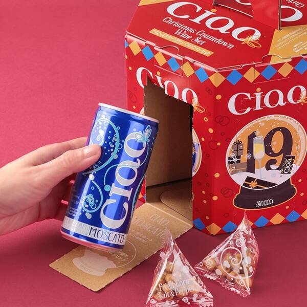 缶ワインとおつまみがセットになったアイテムです。パーティにもピッタリ。クリスマスまでのカウントダウン用としても楽しめます。日付ごとのマスには「Ciaoワイン」と、ワインと一緒に楽しめるスナックが入っています。
