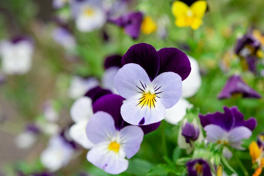 上の2枚と下の3枚の花弁で異なる色合いのツートンカラー。青と紫など同系色の濃淡のものもあれば、紫と黄色といった相対色も。コントラストが鮮やかなので、1株だけの鉢植えでも十分見映えします。