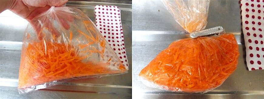 - 人参はしりしり器やスライサー、もしくは包丁で千切りにし、ポリ袋やジッパー付保存袋に入れる。