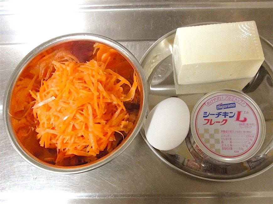 - 人参に火が通ったら、シーチキンの中身、醤油、豆腐をくずし入れてまぜ、全体に火が通ったら、割りほぐした卵を入れて全体をざっくりと混ぜる。