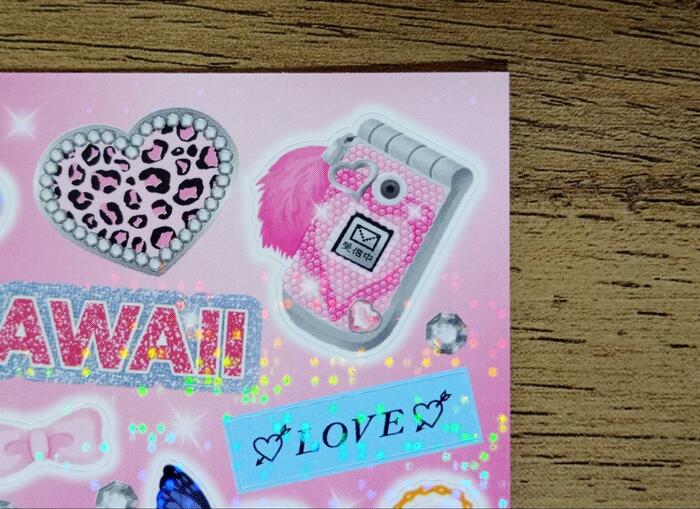 ガラケーなどがシールになっています。2000年代は、ガラケーをラインストーンなどでデコレーションするのが流行しましたが、こちらのガラケーもギャルの持ち物らしくデコレーションされています。