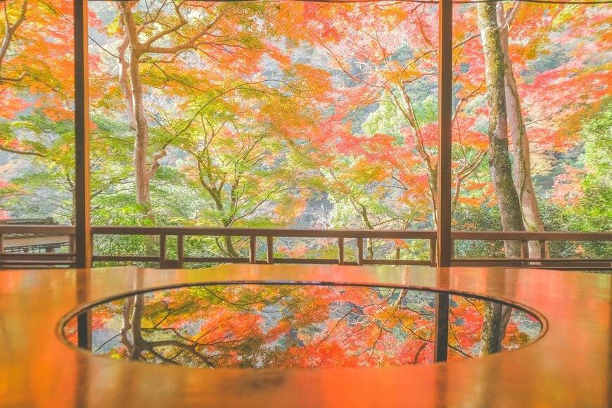12月上旬でも地域によってはまだまだ見られる紅葉。今X上では、丸窓や水鏡など、美しい風景を楽しめることで知られる京都の「嵐山 祐斎亭」で撮影された紅葉リフレクションが注目を集めています。