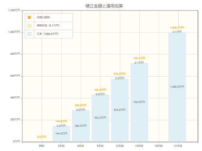 貯蓄だけで積み立てて、かつ預金金利が0.001%のまま続くと想定すると、上グラフのような試算となります。