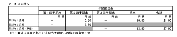 - 2024年3月期・中間配当:13.5円