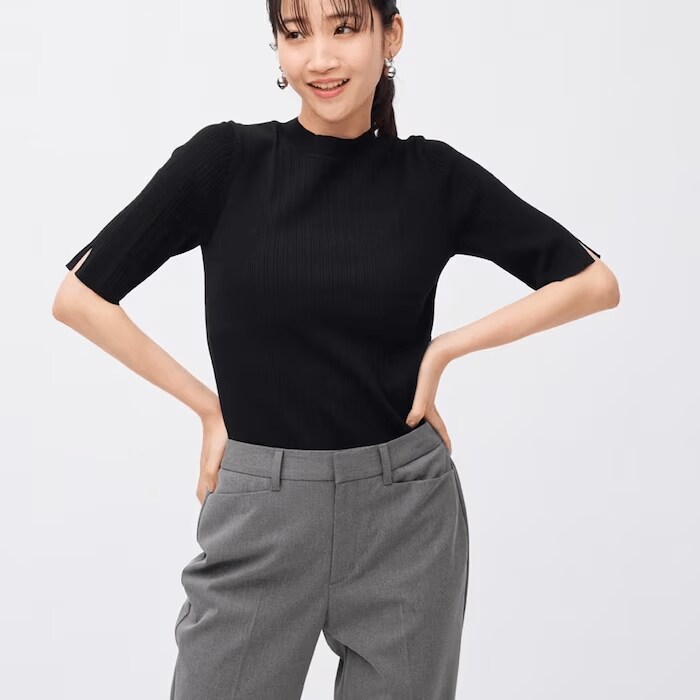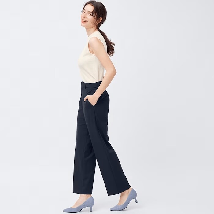 きれいめ素材で仕上げてあり、センタープレスが足をスッキリと美しく見せます。ウエストのサイズ感も特徴的で、お尻から太ももにかけたゆとりある作りは、お尻が目立たなくて良いとユーザーから高評価です。