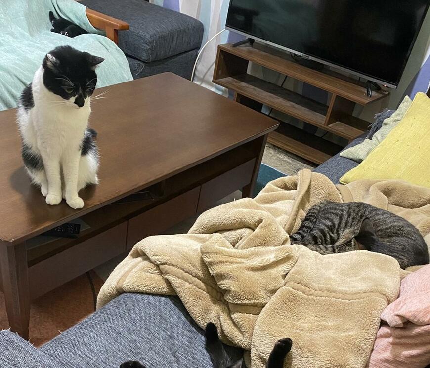 モズク(ハチワレ)は、マイペースです。僕より後に寝て、僕より先に起きているので、どこで寝ているのか分かりません。