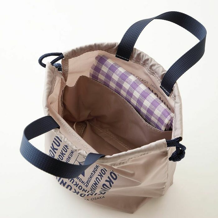 巾着型が可愛らしい手提げバッグです。イギリスの歴史あるブランド「LIBERTY FABRICS」を使用しており、とてもお洒落。中に仕切りが付いているので使い勝手も良いアイテムです。