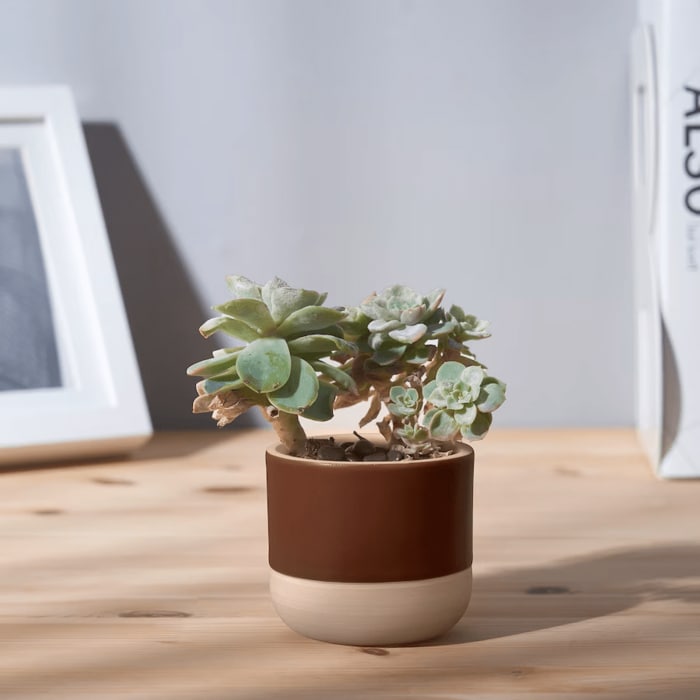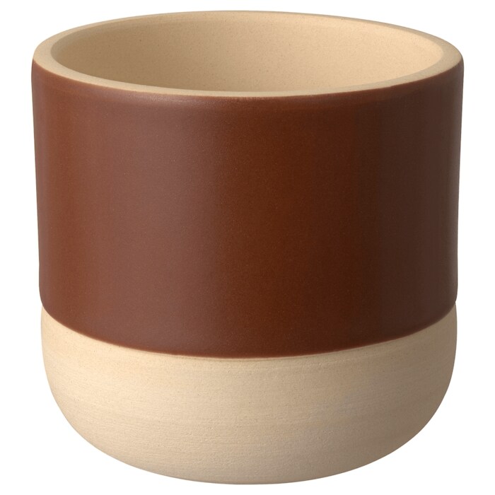 素朴なブラウンのツートンカラーがかわいい「MAJROSKOGEN マイロスコーゲン」鉢カバーは6cmのミニサイズ。こちらも100円均一の観葉植物や、挿し木や挿し芽で増やした植物を入れるのにピッタリなアイテム。