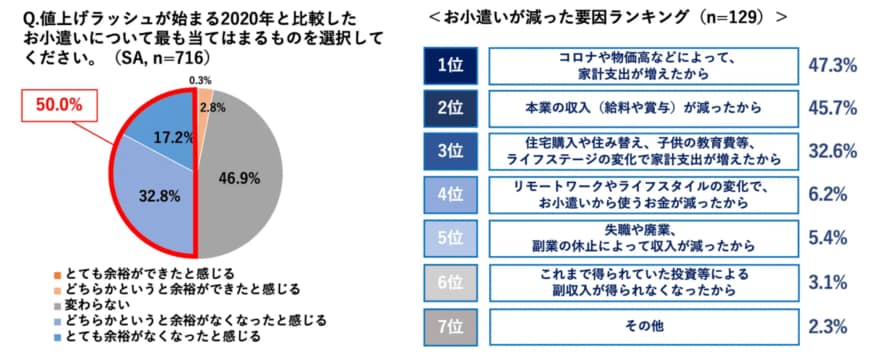 さらにお小遣いが「減った」と回答した人の平均減少額は「1万4543円」で、減った要因の約半数が「コロナや物価高などによって、家計支出が増えたから」と回答しています。
