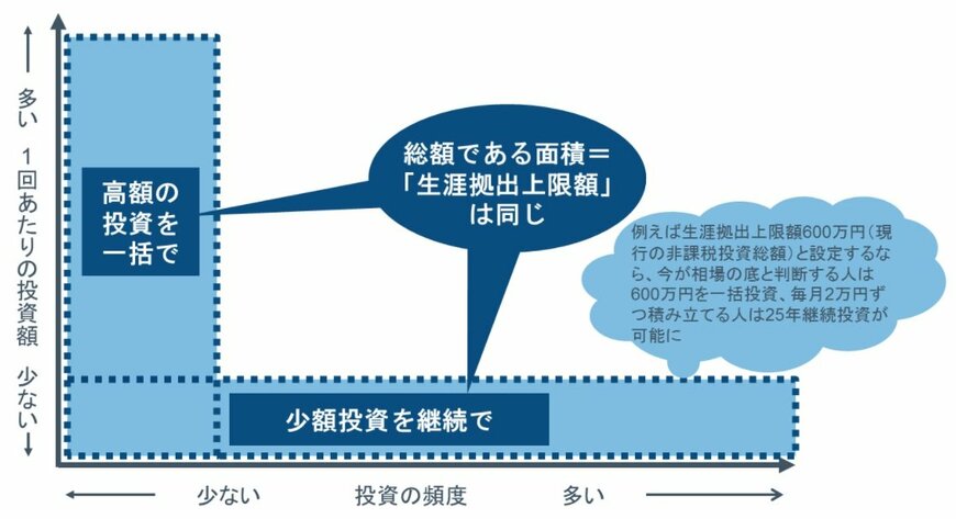 たとえば、生涯拠出上限額を一般NISAの非課税総額600万円(=年間120万円 × 5年間)にして、その使い方は本人の自由にするという建付けです。今がマーケットの底だと考える人は600万円をその年に一括で投資してもいいし、毎月2万円を投資する資産形成層には25年間継続することが可能にもなります。