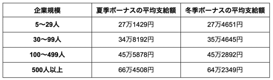 夏季・冬季ともに、企業規模が大きいほどボーナス支給額の相場も大幅に増加しており、企業規模「5〜29人」と「500人以上」では相場が約2倍も異なることがわかります。
