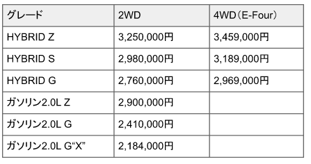 2.0Lガソリン車が218万4千円から290万円となっています。