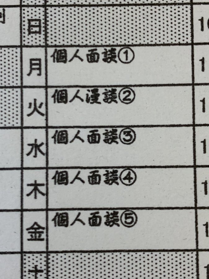 そこに収められているのは、学校から送られてきた案内。月曜から金曜まで「個人面談」と書かれているのですが、火曜日だけ「個人漫談」になっているのです。