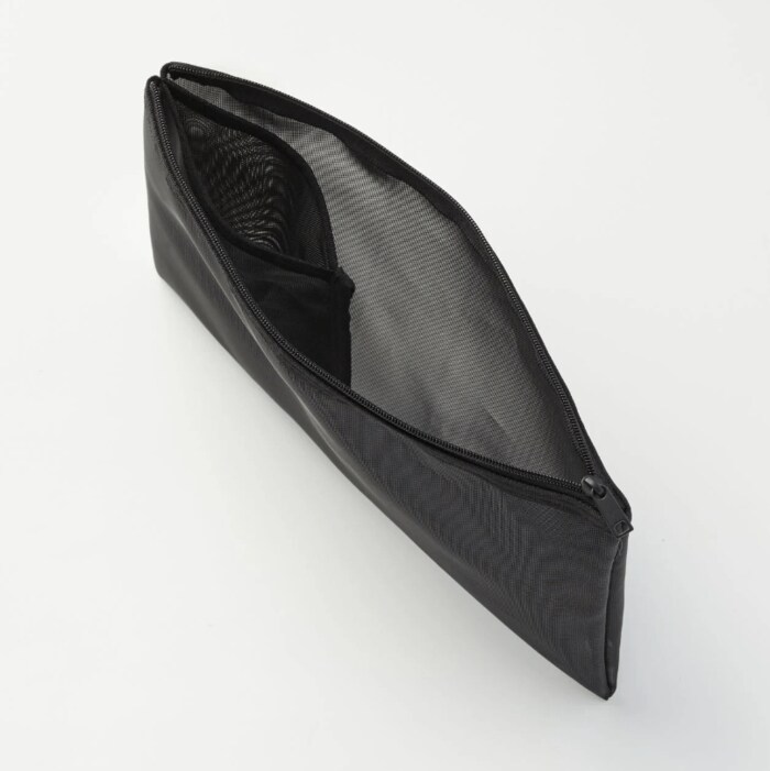 メッシュ素材で、内側にも小さなポケットがあるポーチ。メモ帳やパスポートなどの小冊子と、ハサミやペンなどの事務用品をすっきり仕切って収納できます。ポケットがないポーチだと、ペンが底に倒れて取り出しにくいといった経験がある方も多いのではないでしょうか。こちらのポーチなら、ペンも立てて収納できるのでさっと取り出せますよ。