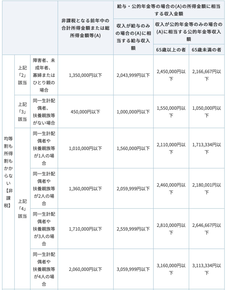 - 総所得金額等の合計額が35万円×(控除対象配偶者及び扶養親族の数+1)+10万円+ 32万円(=加算額)以下の場合は所得割が非課税となります。