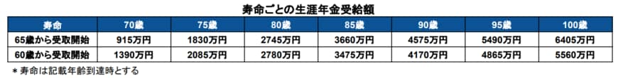 さきほどのシミュレーション結果をもとに、寿命ごとに生涯でいくらの年金を受け取れるのかシミュレーションしてみましょう。シミュレーション結果は以下のとおりです。