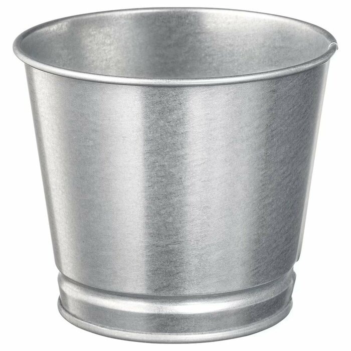 さびに強い、亜鉛メッキスチール製の鉢カバー。9cm径の植木鉢が入るサイズで、お値段なんと1個税込79円。
