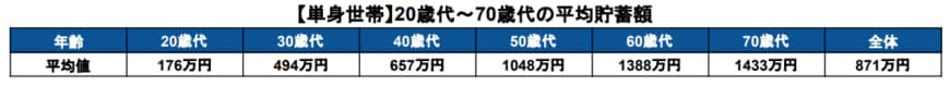 1. 【単身世帯】20歳代~70歳代の平均貯蓄額はいくらか