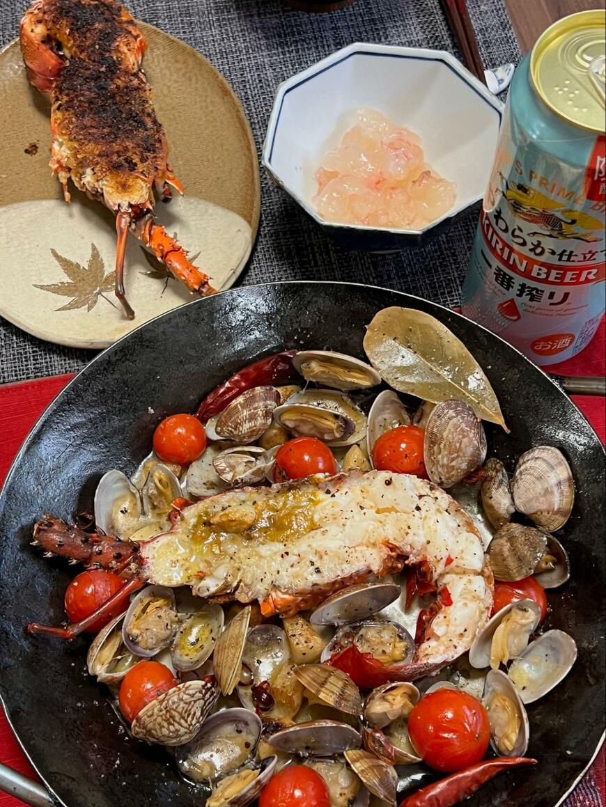 伊勢海老は、2匹をアクアパッツア、刺身、チーズグリル焼き、味噌汁にして海老祭りを開催したそう。その味については、「どれも味が濃厚で絶品でした」と説明する@K_theHermitさん。
