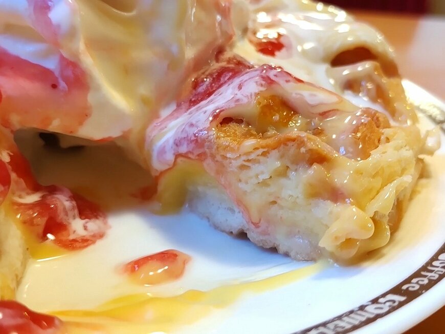 注文から10分ほどでシロノワール(通常サイズ)が運ばれてきました。カスタードソースの濃厚な甘い香りが漂ってきます。見た目も赤いいちごソースとカスタードソースが加わることで通常のシロノワールと比べても色鮮やかですね。贅沢感があります。
